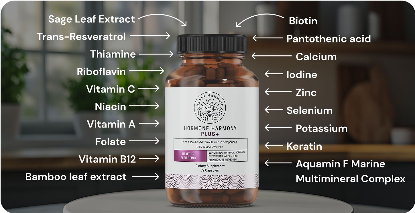 Here at Happy Mammoth, we make sure our customers love their product, or we’ll refund 100% of their investment on the first bottle. We’re so confident that you’ll enjoy Hormone Harmony Plus, that we’ll bear all the risk.