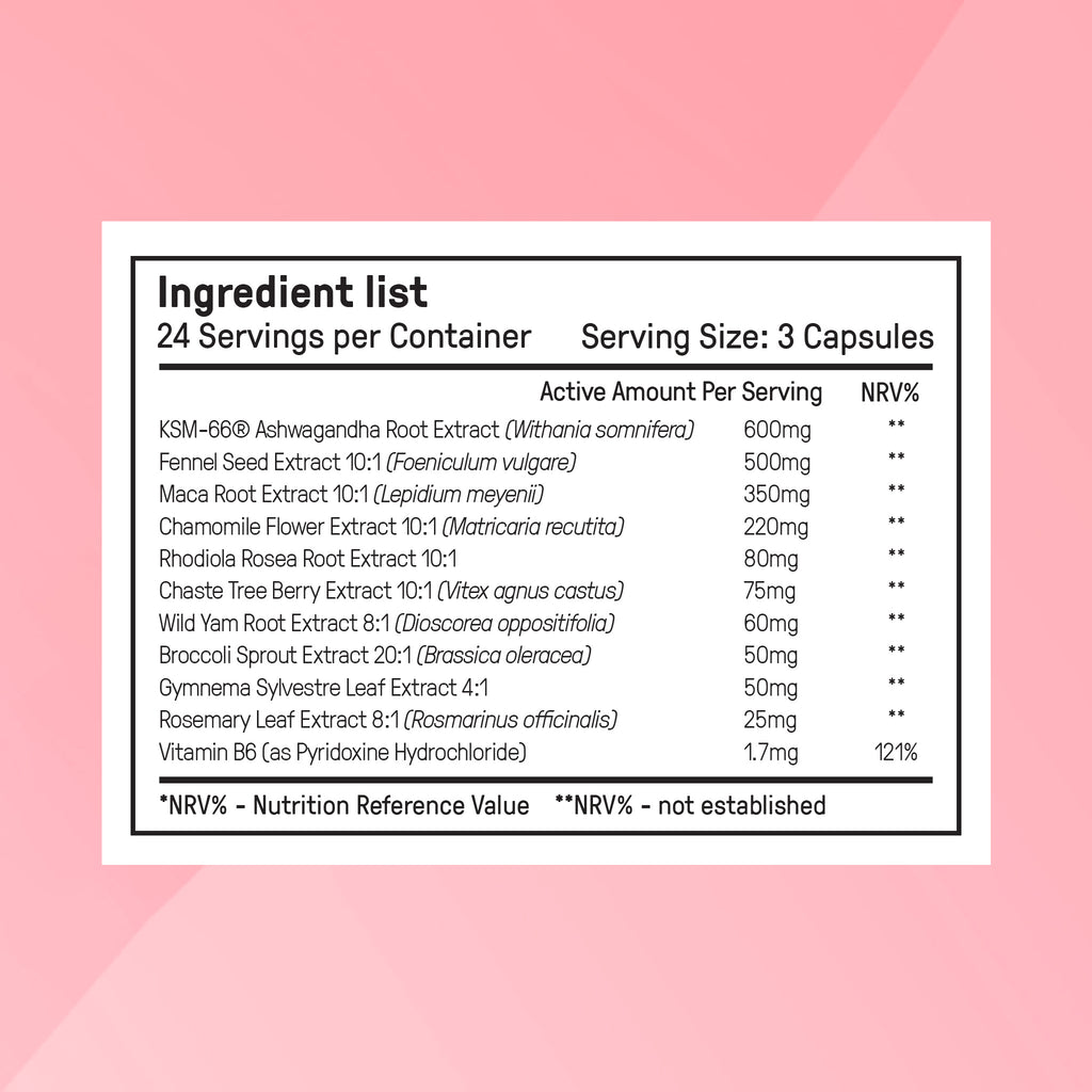Maca Extract 10:1 [2000mg]; Chamomile Extract 2% Flavones, 1.2% to 2.5% Apigenin, 4- 10:1 [1,200mg]; Ashwagandha Extract 25:1 [1200mg]; Fennel Seed Extract 10:1 [900mg]; Chaste Tree Berry Extract 0.5% 10:1 [700mg]; Rhodiola Rosea Extract (Rhodiola5PlusTM) 3% Rosavins+2% Salidroside HPLC 10:1 [680mg]; American Ginseng Root Extract 8:1 [520mg]; Rosemary Extract 7.5% Rosmarinic Acid HPLC 8:1 [200mg]; Gymnema Sylvestre Extract 4:1 [160mg]: Berberine Extract 6:1 150mg